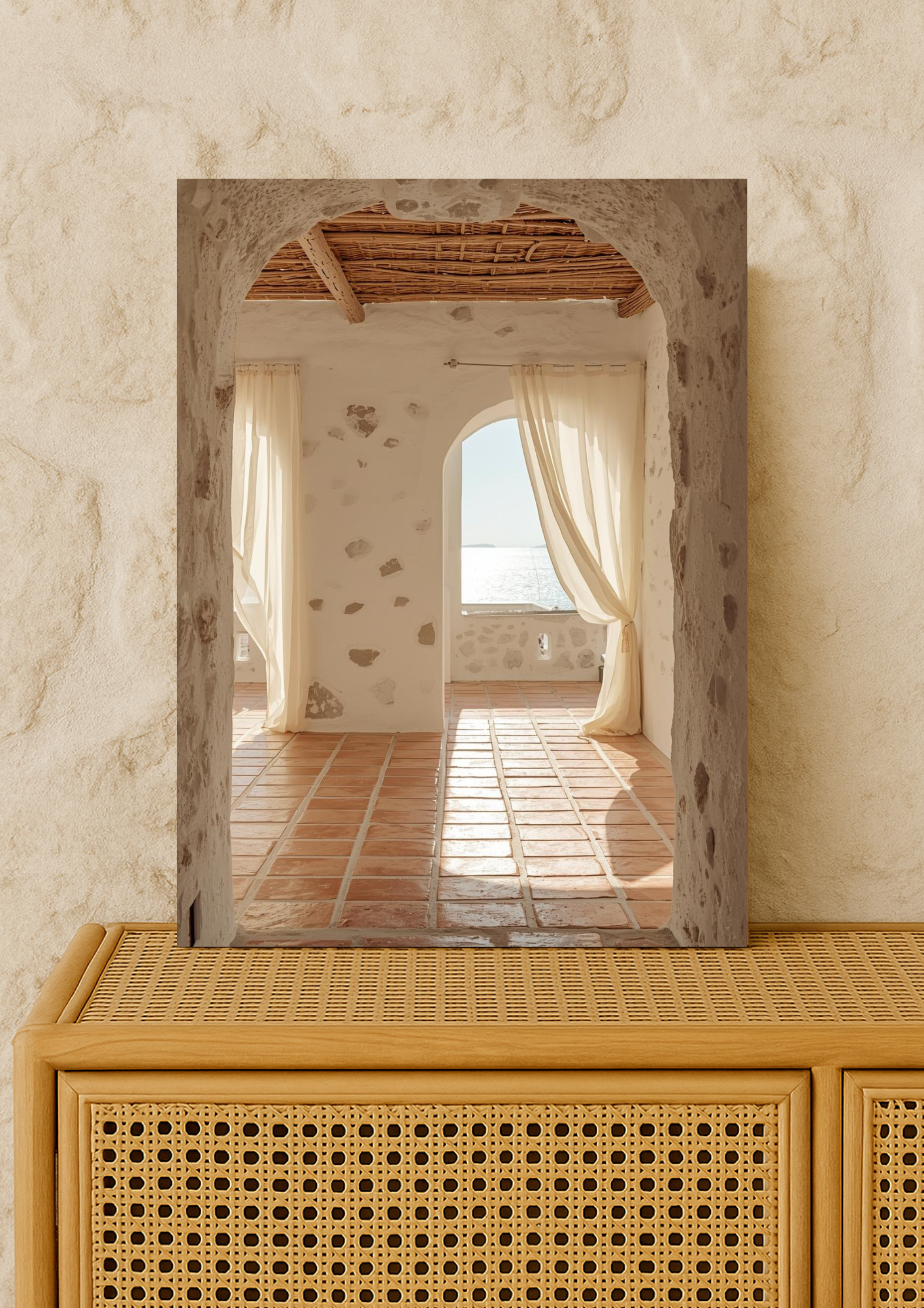 Affiche intérieur méditerranéen – Arche en pierre et vue mer – Décoration murale